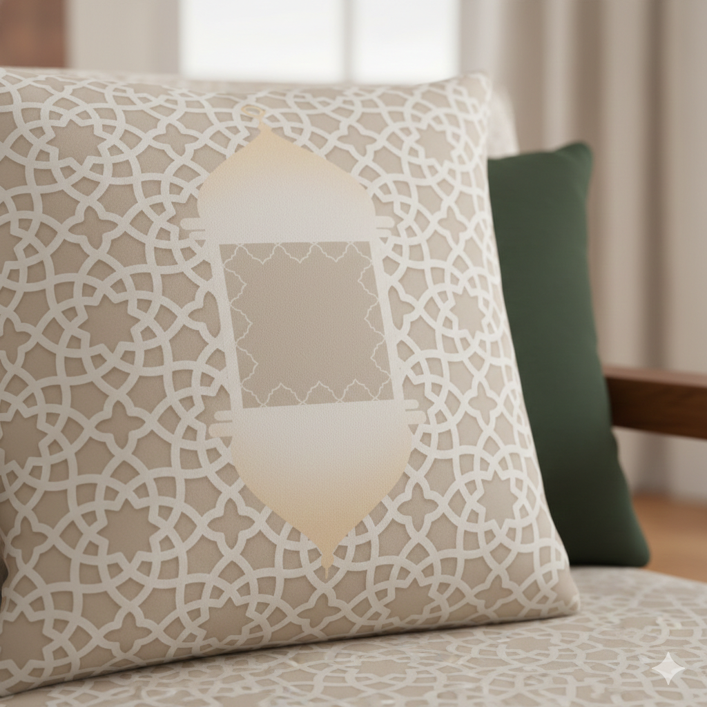 A soft beige cushion featuring a central Ramadan lantern motif and geometric lattice.