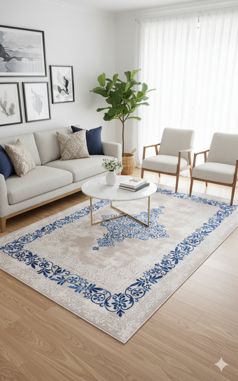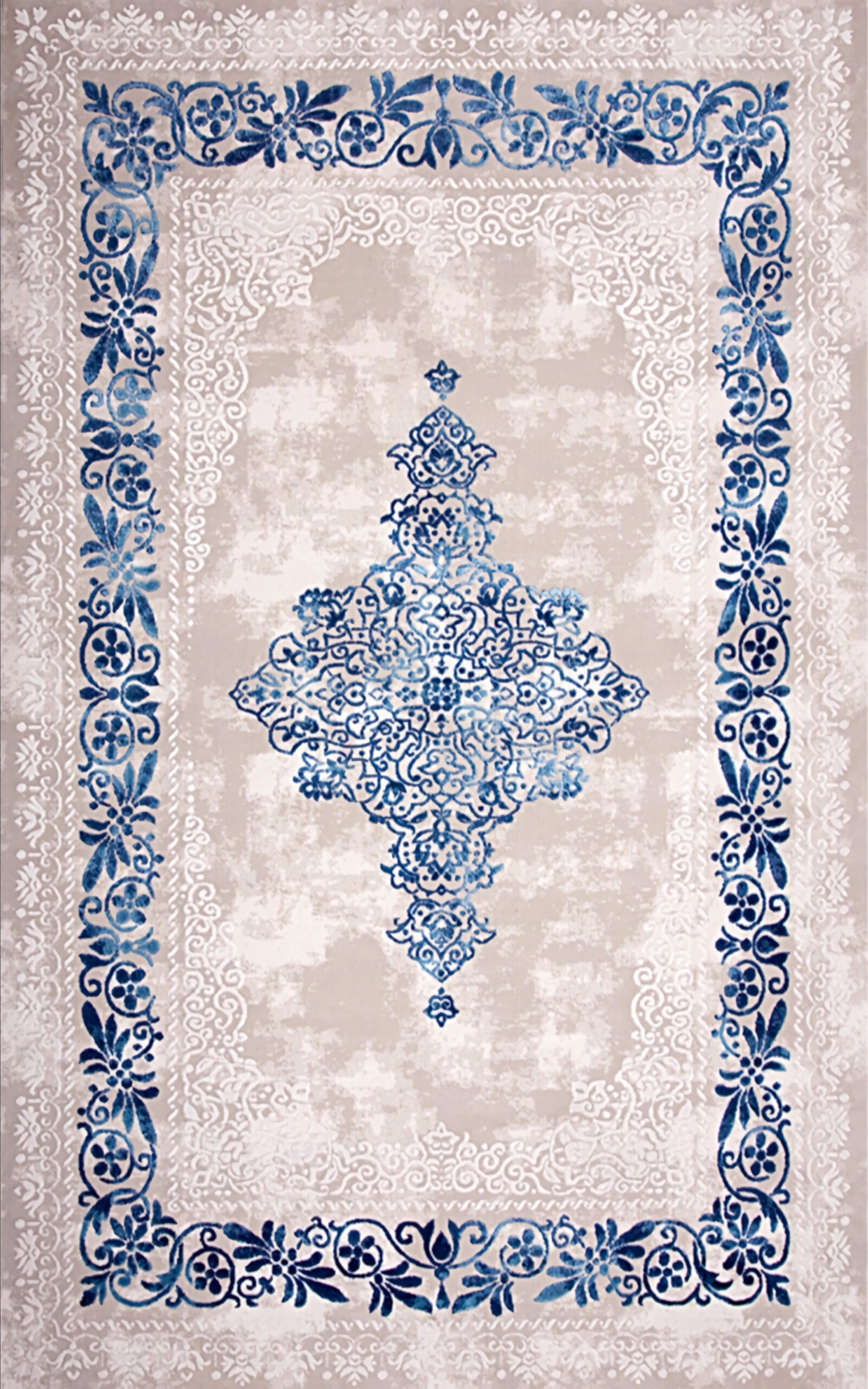 capturing the charm of traditional Persian design, this rug features delicate blue scrolls on a neutral beige base.